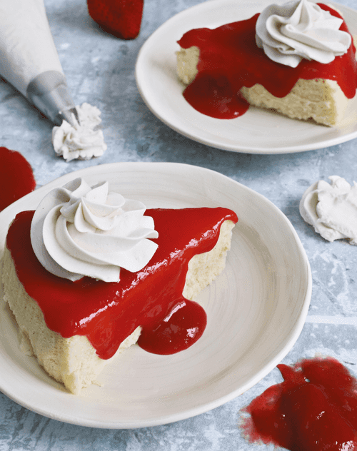 Cut a piece of cheesecake and drizzle with strawberry sauce.