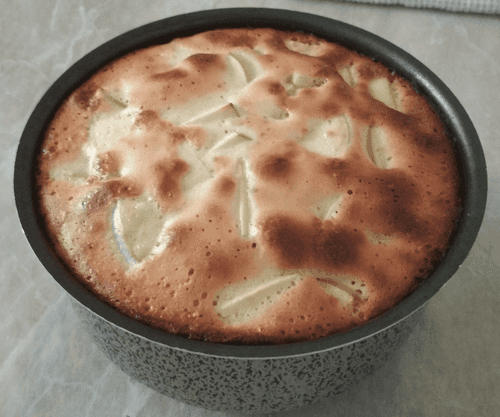 Preheat the oven to 180 degrees. While the oven is heating, add the chopped apples to the liquid batter and mix everything gently again.