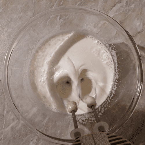 Beat the eggs with sugar, vanilla sugar, and salt at maximum speed for 5 to 10 minutes depending on the mixer power.