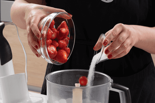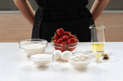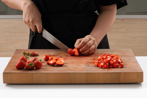 Cut 170 grams of strawberries into cubes, and cut another 170 in half.