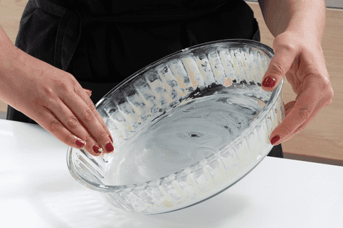 Grease a 23 cm diameter pan with butter and dust with flour. Preheat the oven to 190 degrees.
