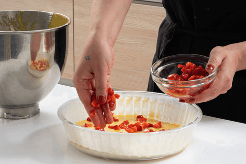 Pour half of the batter into the prepared mold. Top with 170 grams of diced strawberries, then spread the remaining batter on top.