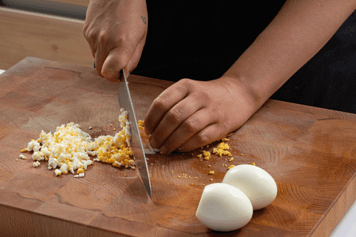 Prepare the filling. Boil 3 eggs hard, cool them down, and cut into small cubes.