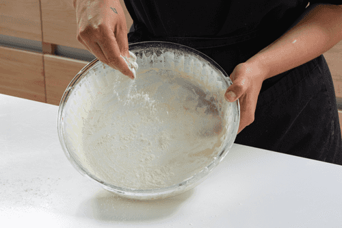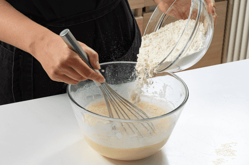Gradually add 270 grams of sifted flour. It's easier to mix it with a whisk at first, then with a spoon.