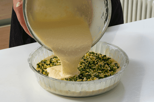 Put half of the dough into the mold (easier with a spoon, but you can also pour it). Distribute the filling over the dough.