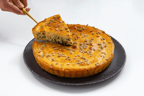 Egg and green onion pie is a cozy memory of Russian cuisine where simplicity meets rich flavor. This pie is especially popular in spring and summer when fresh green onions add aromatic freshness to the dish. The tender kefir dough is airy and soft, while the filling of boiled eggs and lightly fried onions provides a harmonious blend of creaminess and mild spiciness. The golden crust highlighted by seeds adds textural variety. The pie can be served warm or chilled, making it an ideal treat for family tea gatherings or picnics. It is versatile, easy to prepare, yet has a rich homemade taste that warms the soul.