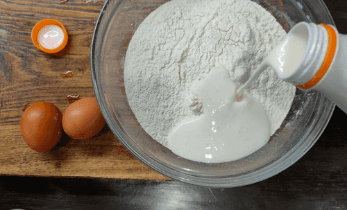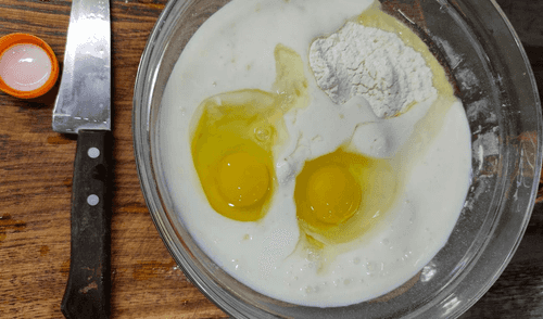 Sift the flour into a bowl, add salt, sugar (2 tbsp), and baking powder. Prepare the yogurt and eggs.