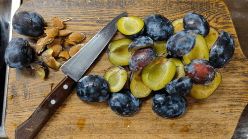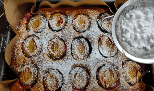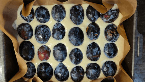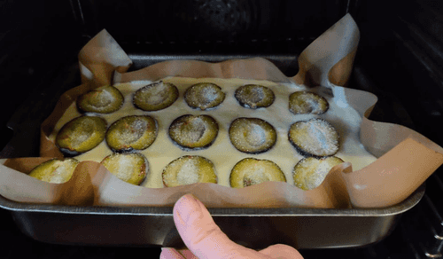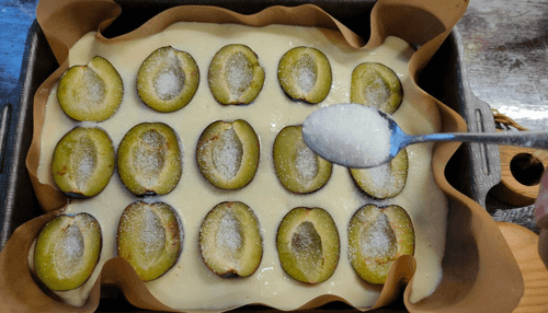 Place the remaining plums on top cut-side up and sprinkle with sugar (just a couple of teaspoons, so the plum releases juice and browns).