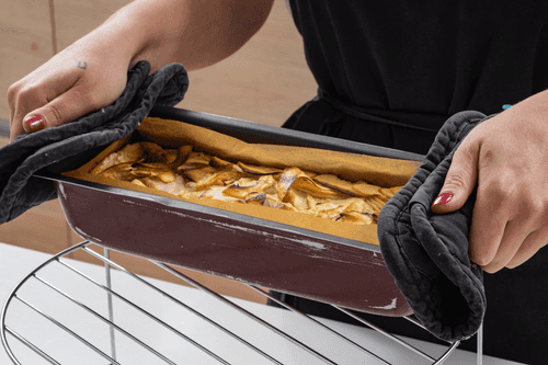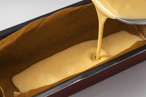 Place parchment paper in a long cake pan. Pour in some batter and top with a thin layer of apples.