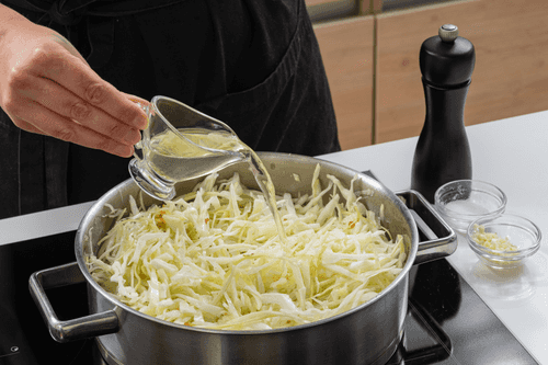 Reduce the heat, pour brine over the cabbage, add finely chopped garlic, cover the pan with a lid and simmer until completely soft, about 20 minutes.