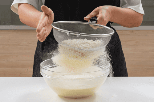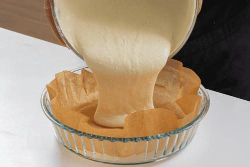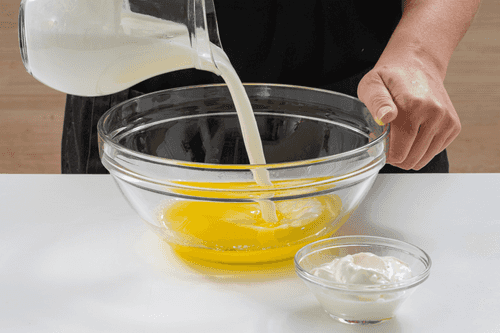 Mix flour with baking powder, sift into the butter and egg mixture, and knead the dough. It should be liquid enough to pour out of the mold like thick sour cream. Therefore, it's better to add flour gradually to achieve the desired consistency.
