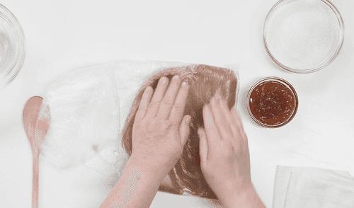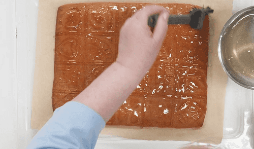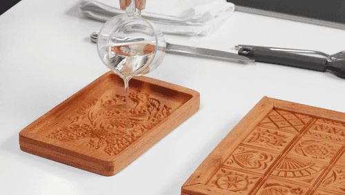 Soak the board in vegetable oil for 10–15 minutes. Then pour off the excess into a dish and lightly dab with a towel. For the next cookies, brush the board with oil. There's no need to wash it after use, just sweep off the dough. All the oil will be absorbed, which is good for the board.