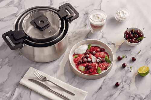 Thaw half of the fresh-frozen cherries (you can do this by moving them from the freezer to the fridge overnight).