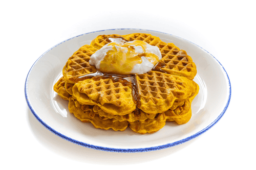 Serve pumpkin waffles with Greek yogurt and maple syrup.