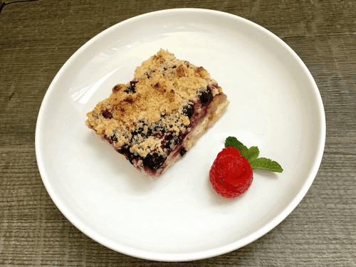 Remove from the oven and let cool. Garnish with berries and mint when serving.