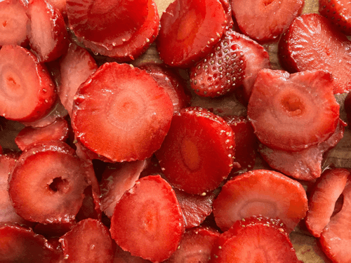 Wash and dry the strawberries. Remove the stems. Slice them into rounds.