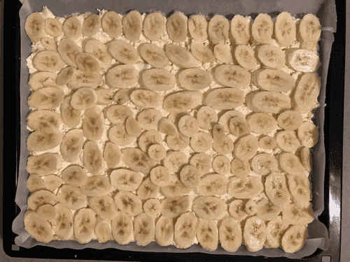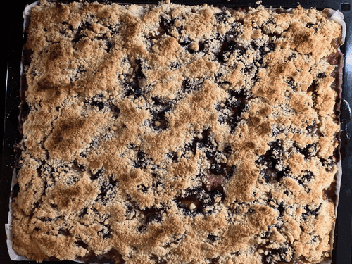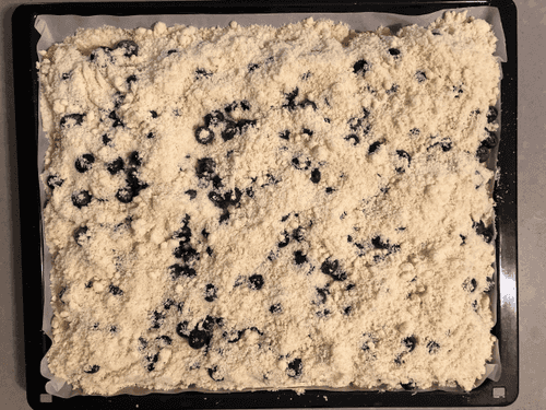 Mix eggs with 1 cup of sugar and cottage cheese. Place most of the dough (flour mixed with sugar and butter) on a parchment-lined baking sheet and top with cottage cheese.