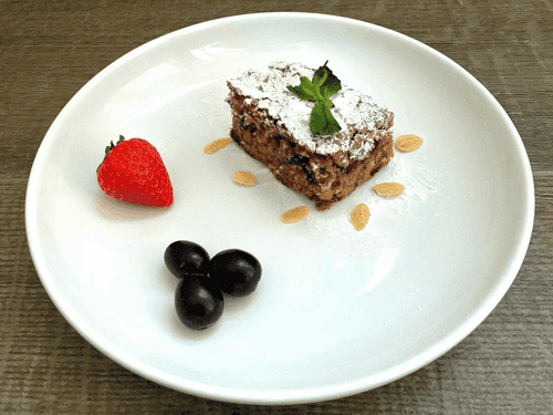 Place in a preheated oven at 180 degrees for 40 minutes. Remove from the oven and let cool. Garnish with powdered sugar, almond flakes, and berries when serving.