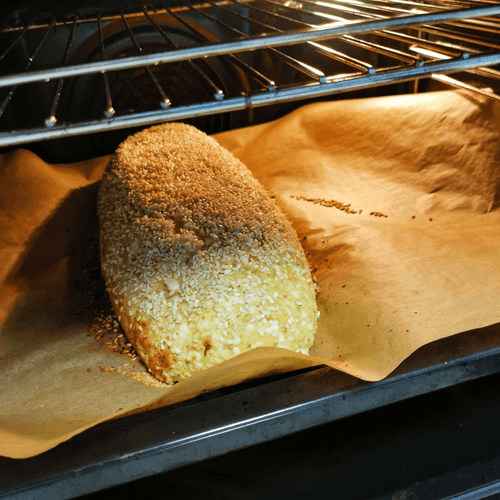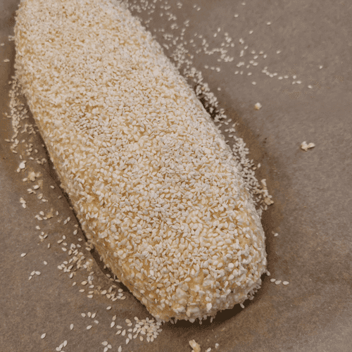 Shape it into the longest baguette possible and sprinkle sesame on top.