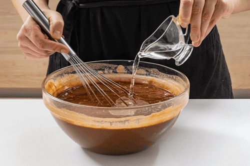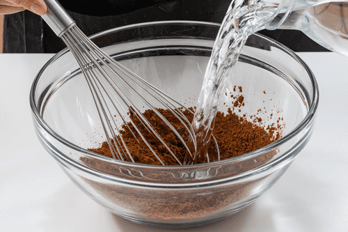 Pour half of the cocoa powder into a large bowl and add boiling water. Let it sit for 2 minutes.