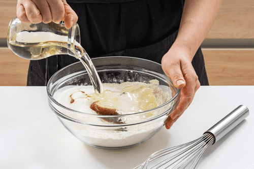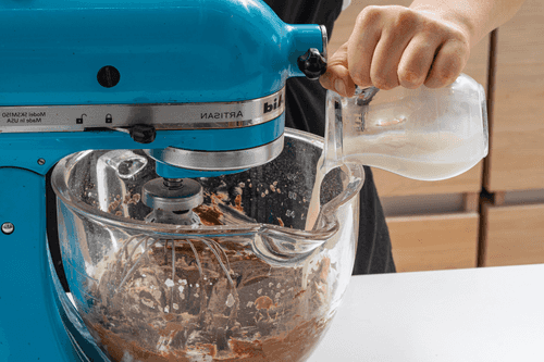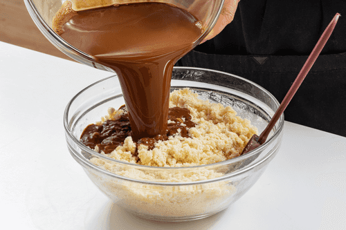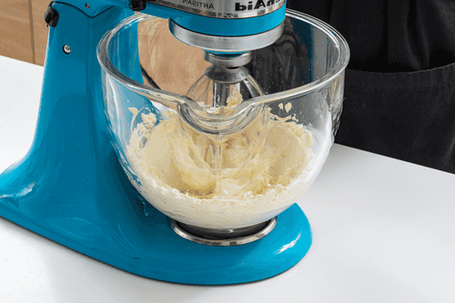 Gradually add the remaining powder and pour in the milk. Periodically clean the sides of the bowl with a silicone spatula to ensure a smooth cream.