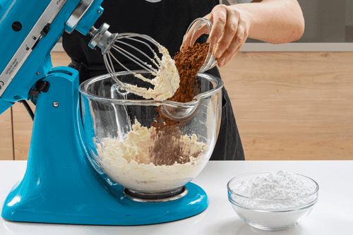 Add the remaining cocoa powder and a third of the powdered sugar. Mix.