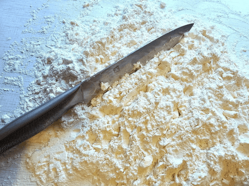 Set aside 4 tablespoons of flour. Chop the remaining flour with butter (200 g).