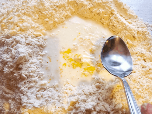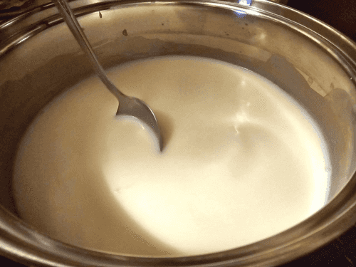 Warm the milk (1/3 cup) slightly and add it to the flour along with vinegar.