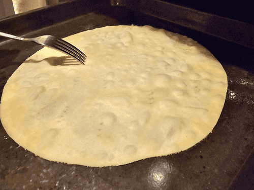 Preheat the oven to 250 degrees. Place the dough on a baking sheet and poke it several times with a fork all over.