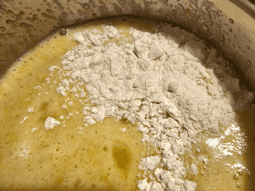 Lightly beat 2 eggs and 0.5 cup of sugar, then add 4 tablespoons of flour. Mix until smooth.