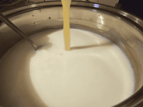On low heat, gradually pour the egg mixture into the milk while continuously stirring until the mass thickens. Cool down.