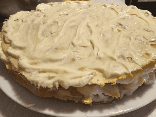 Crumble the delayed cake layer and sprinkle the crumbs on top and sides of the cake.