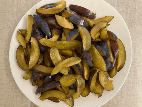 Wash the plums, remove the pit, and slice them.
