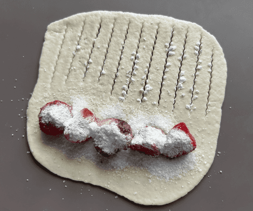 Spread the strawberries and sprinkle with starch and sugar.