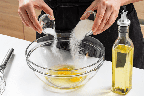Beat the eggs with sugar, salt, and vegetable oil.