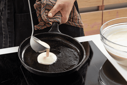 Heat the pan well. Stir the batter again and pour a ladle of batter into the pan, spreading it evenly across the bottom.