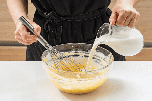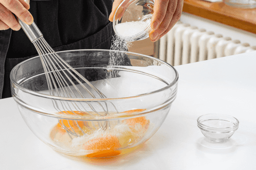 Whisk 3 eggs with 30 g of sugar and salt until the sugar dissolves.
