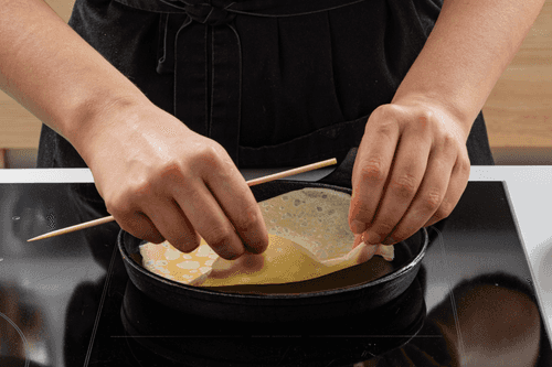 Heat the pancake pan well, grease it with vegetable oil, and pour a little batter onto it, spreading it across the bottom. Fry for 15-20 seconds.