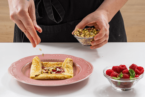 Raspberry and pistachio pancakes are a refined combination of delicate batter, aromatic berries, and nutty crunch. The origins of this dish trace back to Russian culinary traditions, where pancakes have symbolized abundance and the warmth of home for centuries. In this recipe, thin, golden pancakes are soaked in a vibrant raspberry sauce that adds a pleasant tartness and fruity freshness. Whipped cream with matcha adds airy lightness, while pistachios provide a subtle nutty flavor and elegant crunch. This exquisite blend of flavors makes the dish perfect for both a cozy family breakfast and festive tea gatherings. Wrapped in delicate layers, each pancake becomes a small culinary masterpiece, offering harmony of flavors in every bite.
