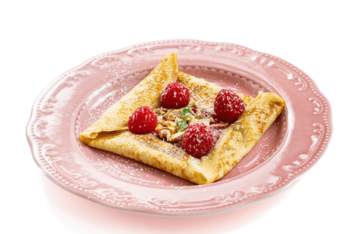Fold the pancake in your favorite way and serve it decorated with fresh raspberries and powdered sugar.