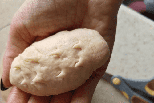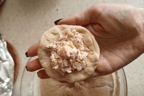 Form a small flatbread from the dough, place the filling in the middle, and pinch the edges.
