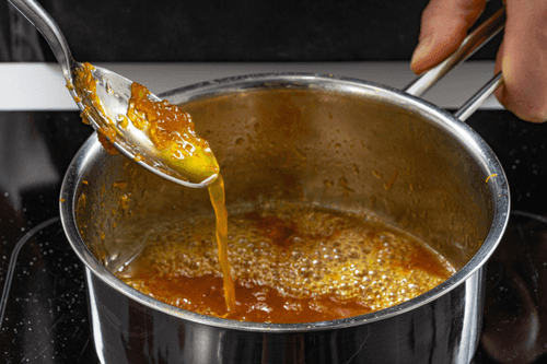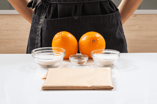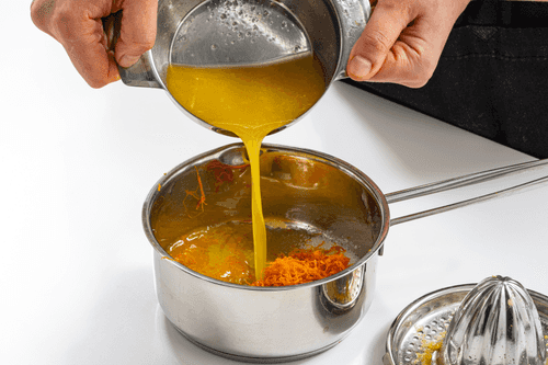 Prepare the glaze. In a saucepan, mix 70 grams of sugar, orange zest, and juice.