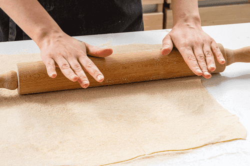 Mix 100 grams of sugar with salt and cinnamon. Spread half of the sugar mixture over the dough. Roll it out slightly with a rolling pin.