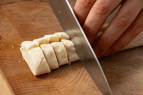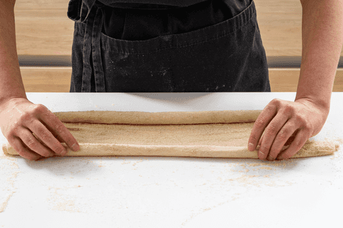 Roll the dough into a log towards the center from both sides. Wrap in paper and send to the freezer for 30 minutes.