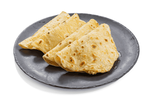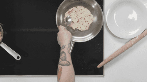 Heat a thick-bottomed pan and fry the flatbread, brushing off excess flour. Fry for about 1 minute on each side.