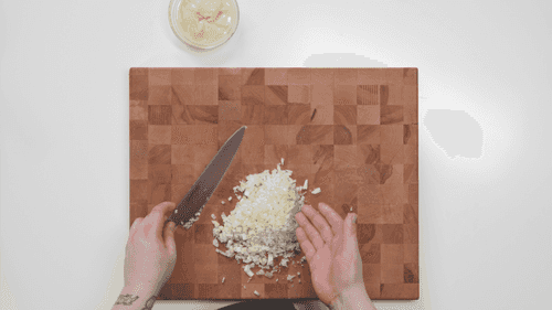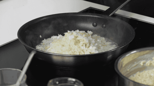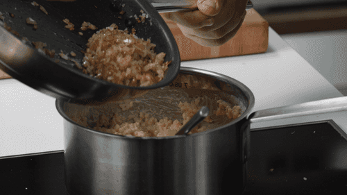 Heat 30 grams of duck fat in a pan, fry the onion until golden. Season with salt and pepper.