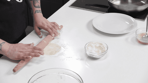 Take a piece of dough weighing about 30 grams, coat it in flour, and roll it out to a thickness of 1 mm.