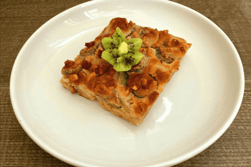 Place in a preheated oven at 200 degrees for 1 hour. Remove from the oven and let cool. Garnish with kiwi for serving.