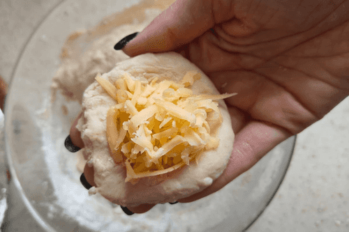 Form a small flatbread from the dough, place the filling in the middle, and pinch the edges.