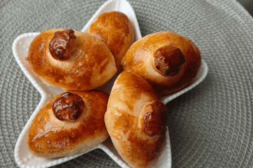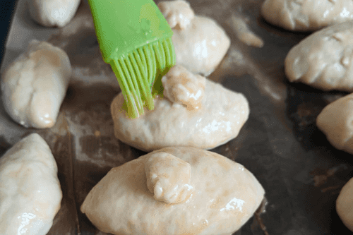 Brush the pastries with egg yolk using a silicone brush. Bake in a preheated oven at 200 degrees for 20-25 minutes until golden brown.